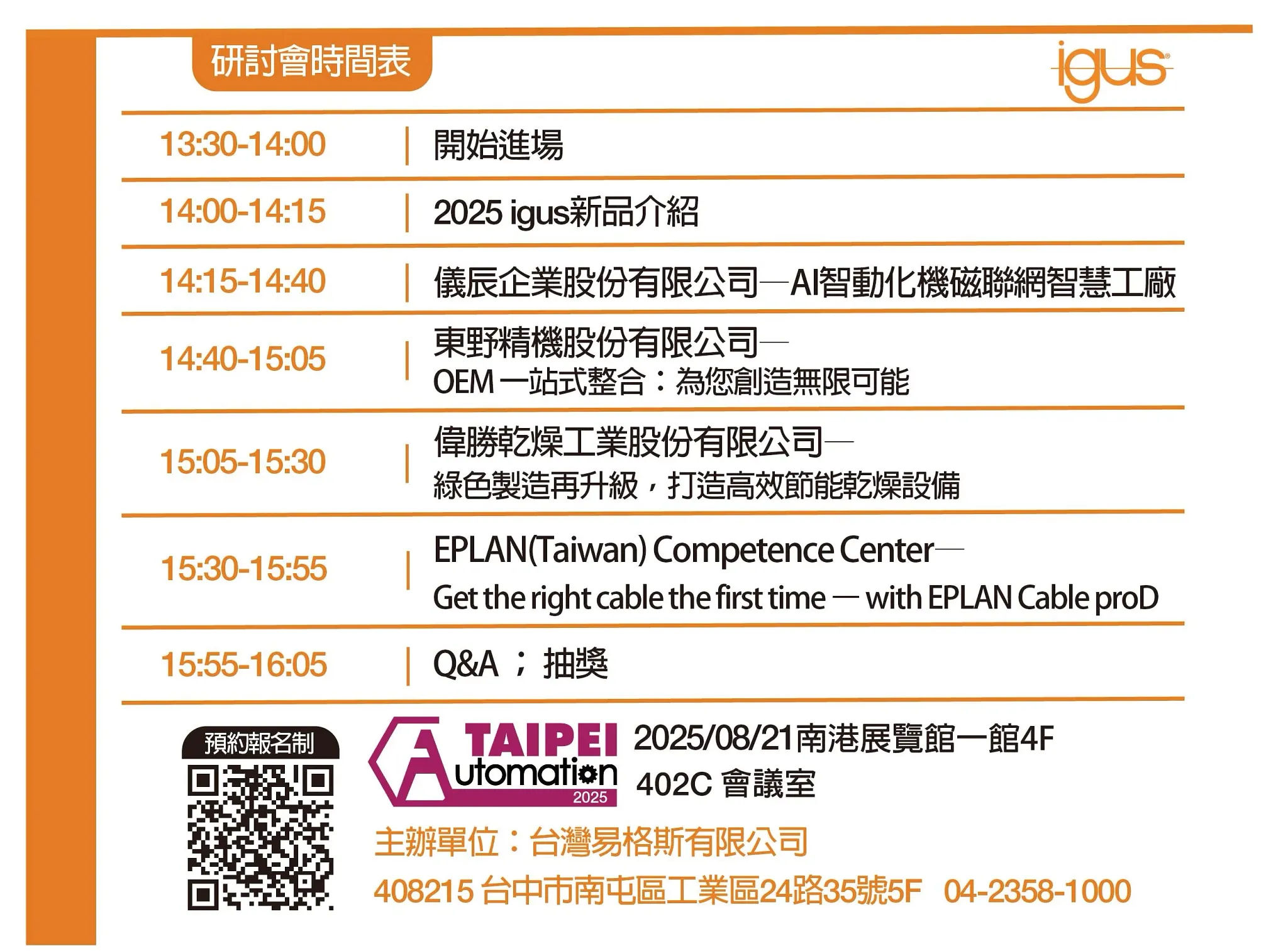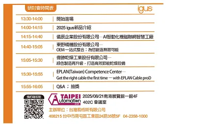 igus 易格斯將於 2025/8/21 (四) 14:00 ~ 16:00 於南港展覽館一館 4 樓 402C 會議室舉辦 ''GO ZERO 從零到永續'' 研討會。