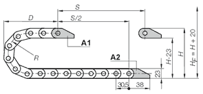 A1=移動端 , A2=固定端 節距:30,5 mm 每米鏈節數= 33 拖鏈長度 = S/2 + K