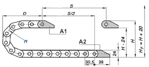 A1=移動端 , A2=固定端 節距:46 mm 每米鏈節數= 22 行程:S 拖鏈長度 = S/2 + K