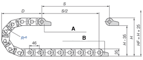 A = 移動端,B = 固定端節距:46毫米每米鏈節數:22行程:S拖鏈長度= S/2 + K