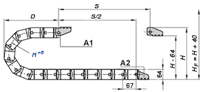 A1=移動端 , A2=固定端 節距:67 mm 每米鏈節數= 15 行程:S 拖鏈長度 = S/2 + K