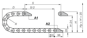 A1=移動端 , A2=固定端 節距:46 mm 每米鏈節數= 22 行程:S 拖鏈長度 = S/2 + K