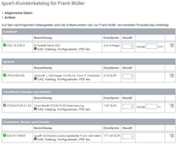 借助自定義的客戶目錄,每個客戶都可以直接從igus®產品組合中選擇編輯自己的相關物品。 因此您登錄後即可在myigus空間中概覽各個零件。
