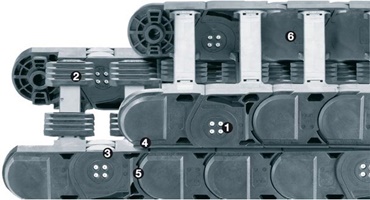 幾乎免維護的易格斯P4系統是一個適用于長行程應用(行程長達800米的起重機設備或傳送系統)的能量供應系統。 上端運行拖鏈和下端運行拖鏈在運行時不會發生偏移。 這就是說不會有東西會在耐磨損的塑膠滾輪上滑行,但是它們會在大面積的滑行表面上滑行。 自滑行橫杆和特殊導向槽系統的組合可以安全可靠地導向P4拖鏈。 高速應用 (最高可達 10 m/s) 和高負載應用(最高可達30 kg/m)的理想解決方案