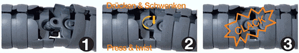 The significantly higher stability of the B version requires a disassembly tool in order to separate the chain links of the e-chain®.