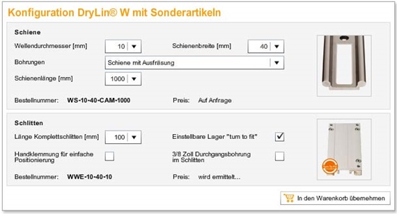 您可在不同的軸直徑和軌道寬度以及所需鑽孔模式之間進行選擇。 您可以指定軌道的長度,然後價格將自動計算。 軌道適用的滑塊是預先選擇的;您可以調整滑塊的長度。 此外,您還可選擇「可調軸承」或「手動夾具」選項。軌道和滑塊可直接放入購物車並顯示價格。 您還可根據需要在此調整所需的數量。