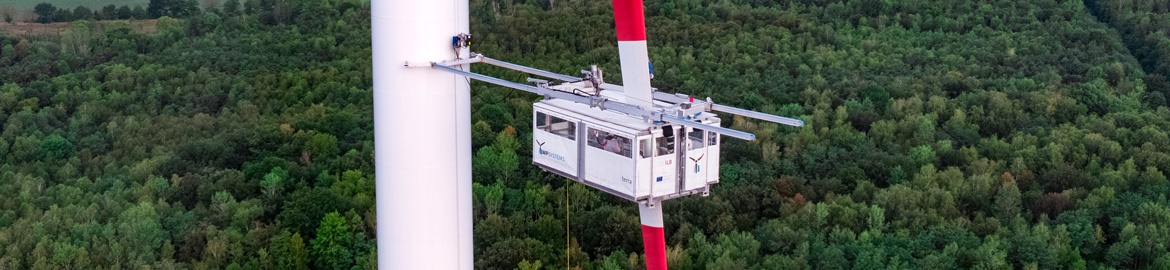 The maintenance platform: The Brandenburg start-up company WP Systems GmbH developed the mobile maintenance platform "terra" system for the rotor blades of wind turbines. Repair and inspection work is now possible at any time, no matter whether rain, snow, sun or wind. The completely closed platform with perfect illumination allows safe work, also at night.  Flexible cables for movement, energy chains and various plain bearing solutions by the motions plastics specialist igus are also on board.