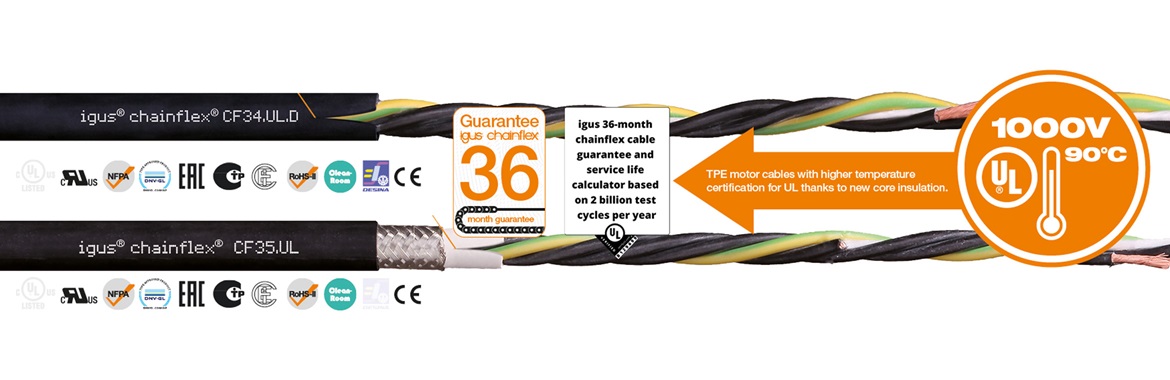 chainflex® 馬達專用電纜現已通過 90°C 和 1000V UL 的更高溫度認證