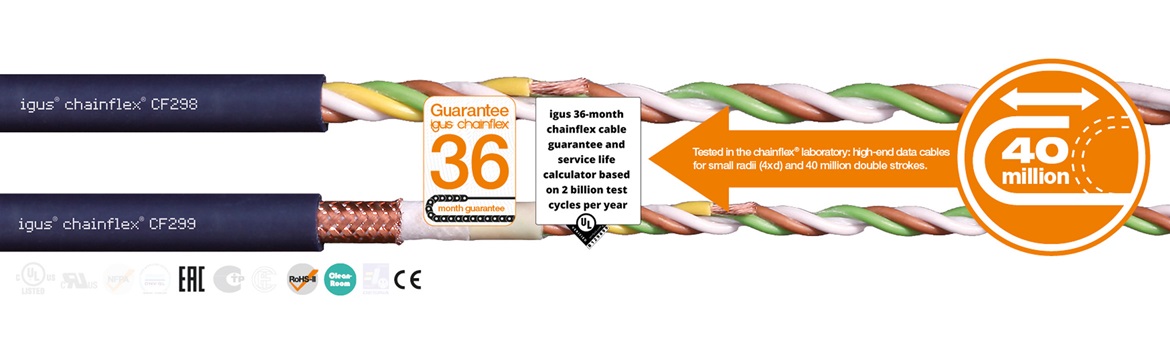 在具有極小彎曲半徑的動態應用中,傳統電纜的銅芯會達到其機械應力的極限。 正是在這種情況下,igus® 現在保證在其 CF298(無隔離網)和 CF299(帶隔離網)數據電纜系列上實現 4000 萬次往返次數,.並且在拖鏈中移動數據電纜時彎曲半徑最小(4xd)。 這主要歸功於新的高性能合金導線材料與耐彎曲 igus® TPE 外護套(防止裂縫和斷裂)的組合。